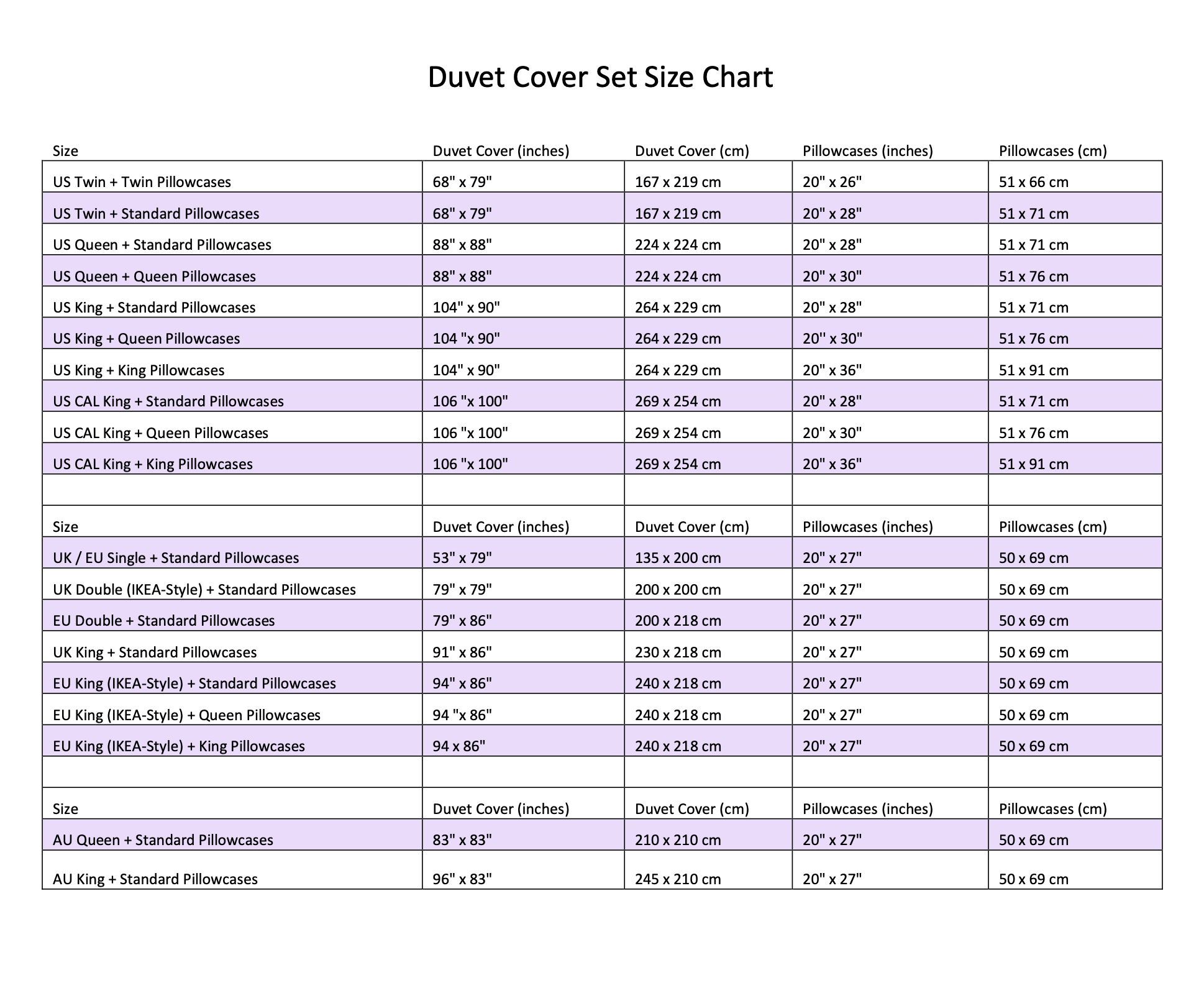 Cal. King Set Duvet + Pillowcases - choose colour in drop down