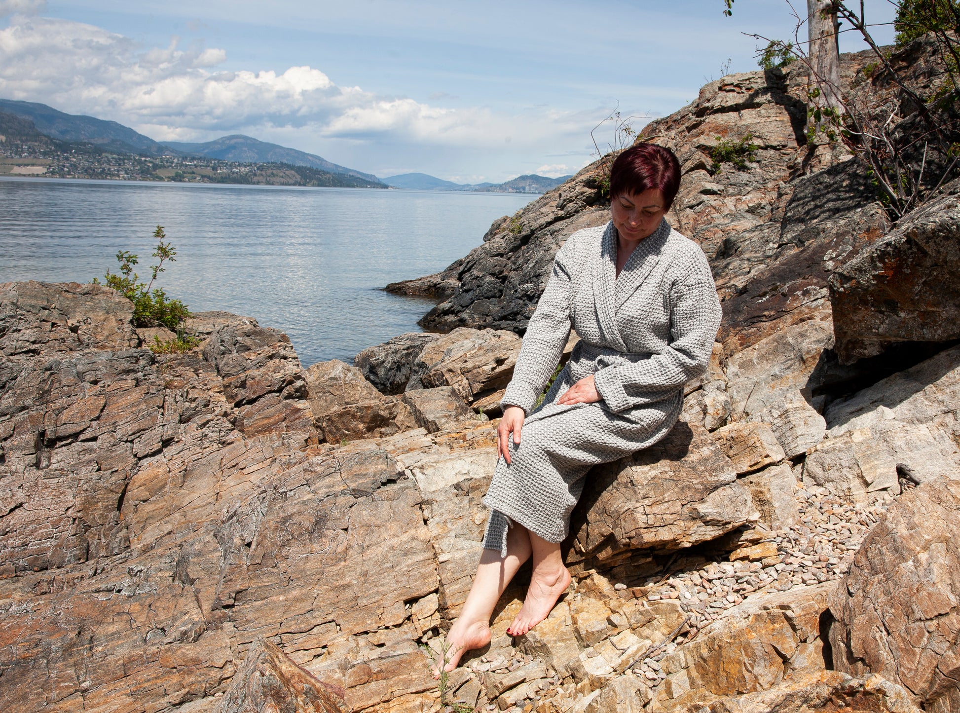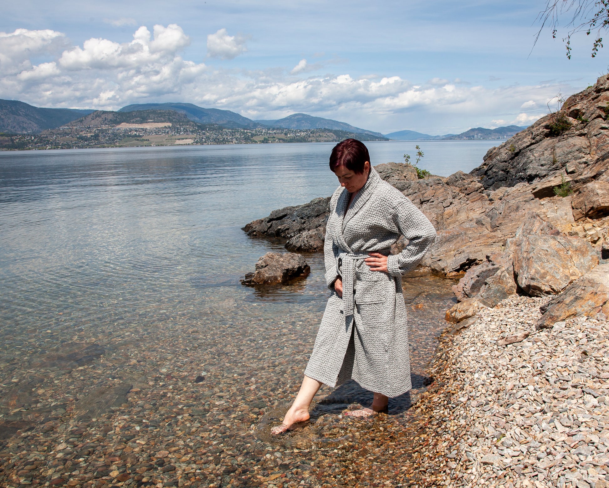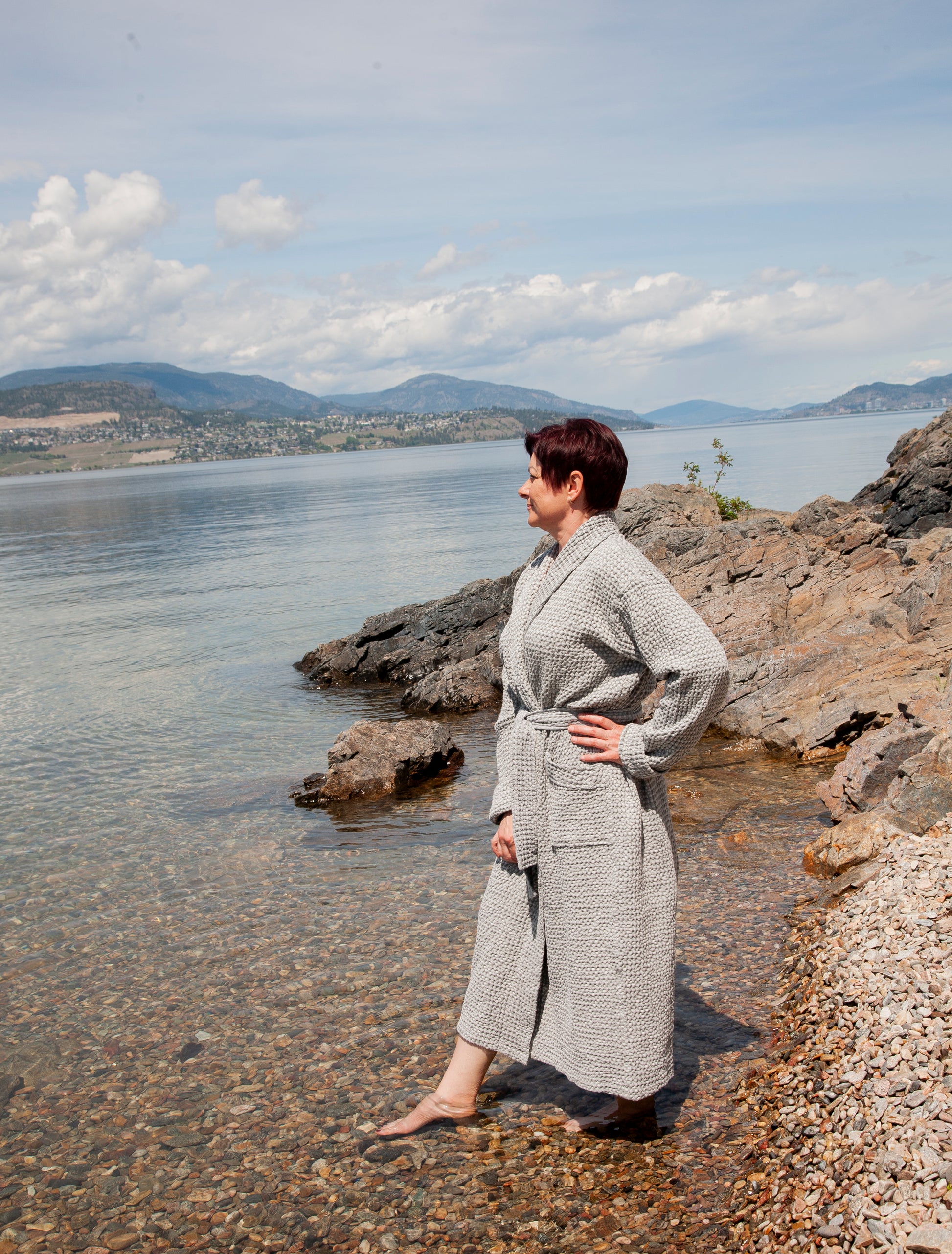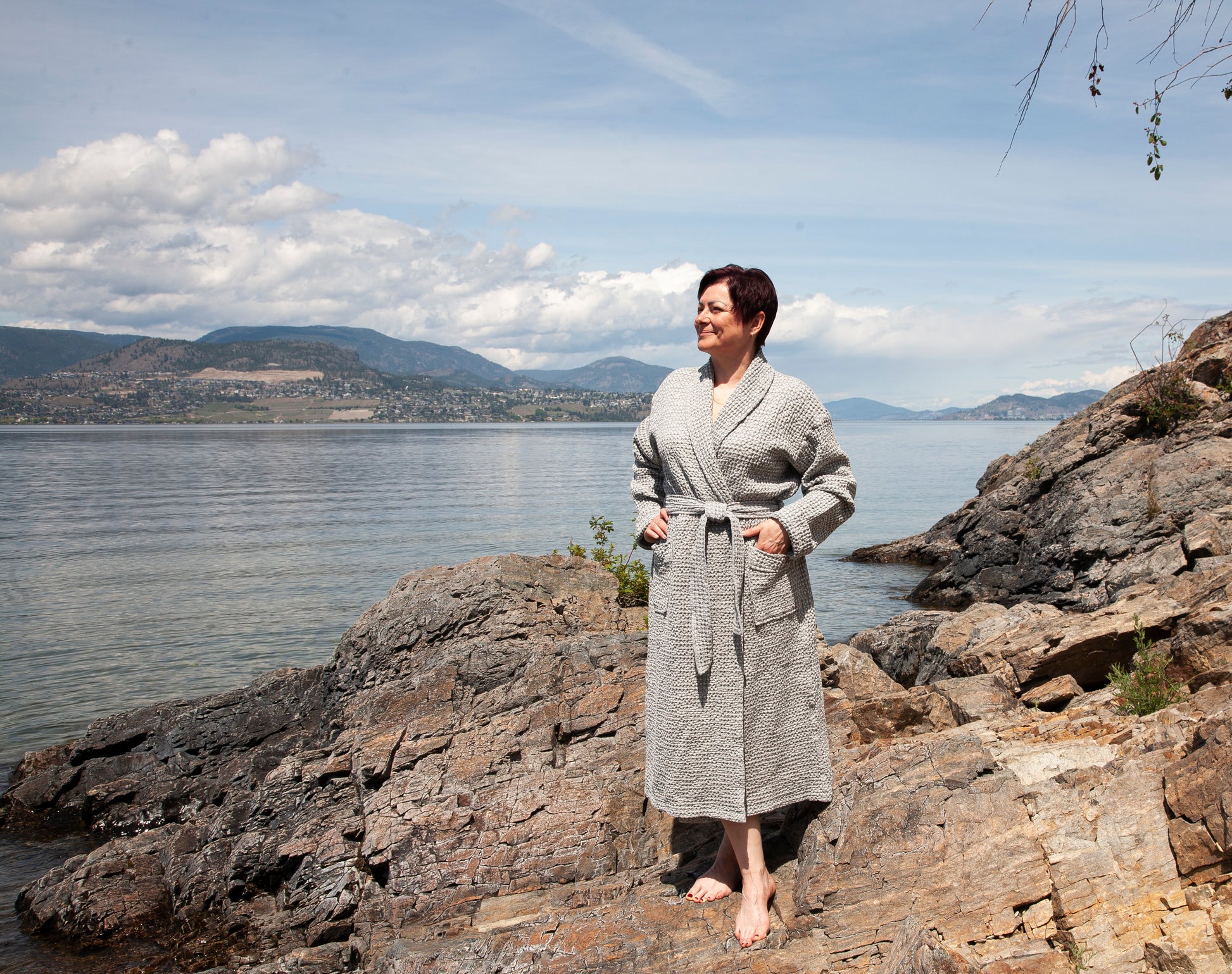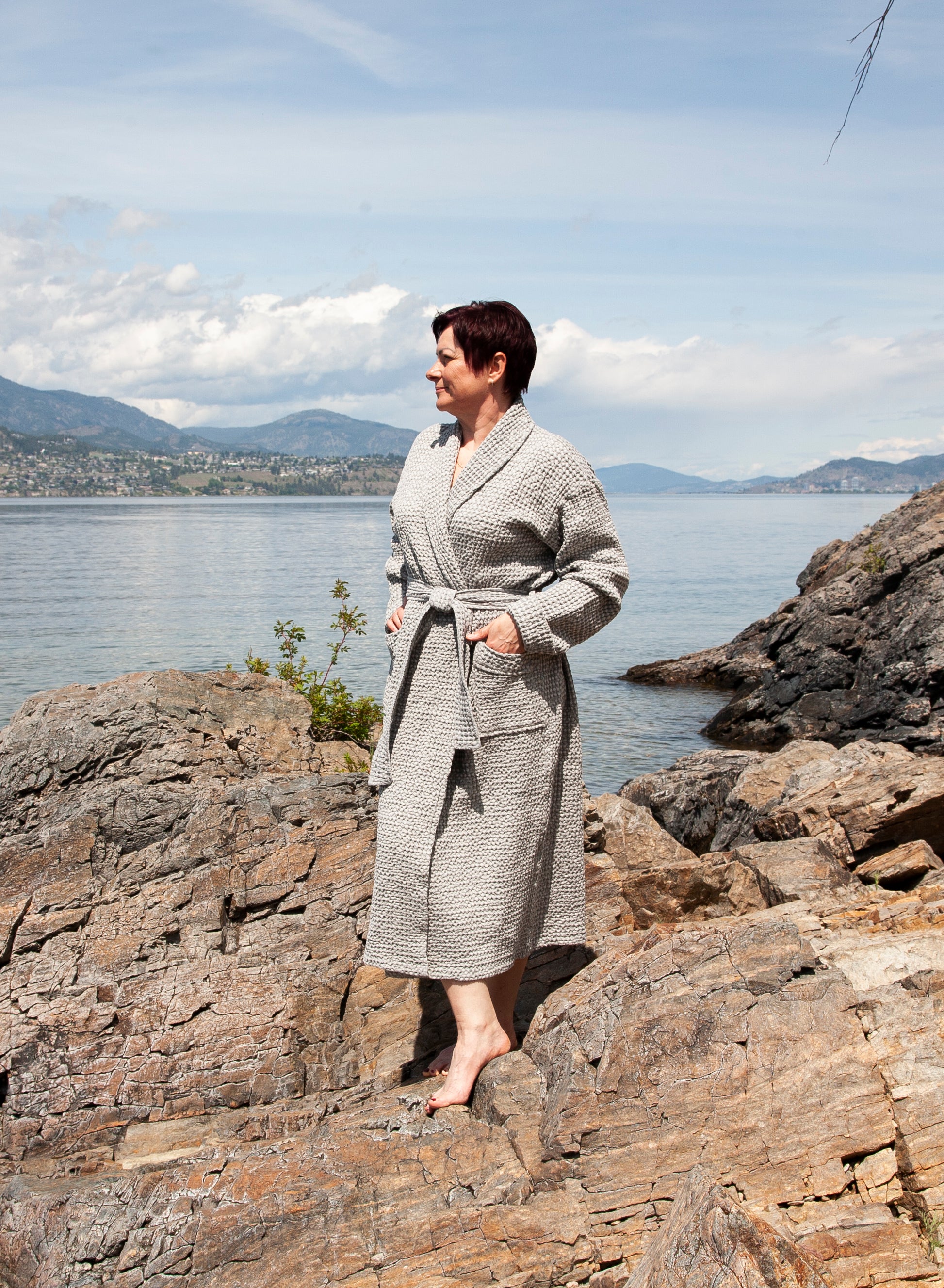 The bathrobe is available in two lengths to ensure it's not too long for short people and not too short for tall people. You will also find two large pockets in the front, to stash your goodies in. We ensured that this robe comes with long arms, the thick sewn cuffs make it easy to fold and stay in place if you prefer to have the arms shortened. Lastly, we wanted to make sure that the waffle fabric was not only absorbent, but also thick enough to feel like you are going to the spa. The perfect blend of 40% linen and 60% cotton, this bathrobe will make you want to wish it was appropriate to go out in public wearing a robe.