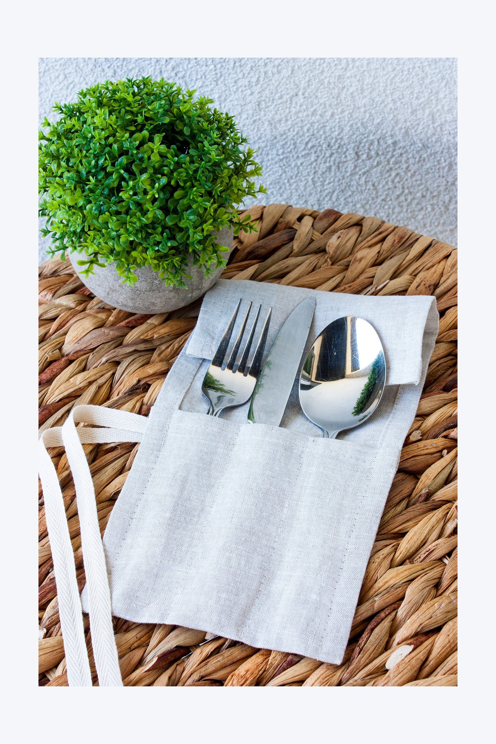 Perfect for your eco-friendly lifestyle. Simply slip your favourite utensils into your Cutlery Roll and go. Because linen is such a wonderful fabric made from earth you can throw it in the wash endless times, in fact it develops more character every time you take it out of the wash. For your convenience we added a flap up top in case you have messy cutlery that you do not want to come in contact with your bag.