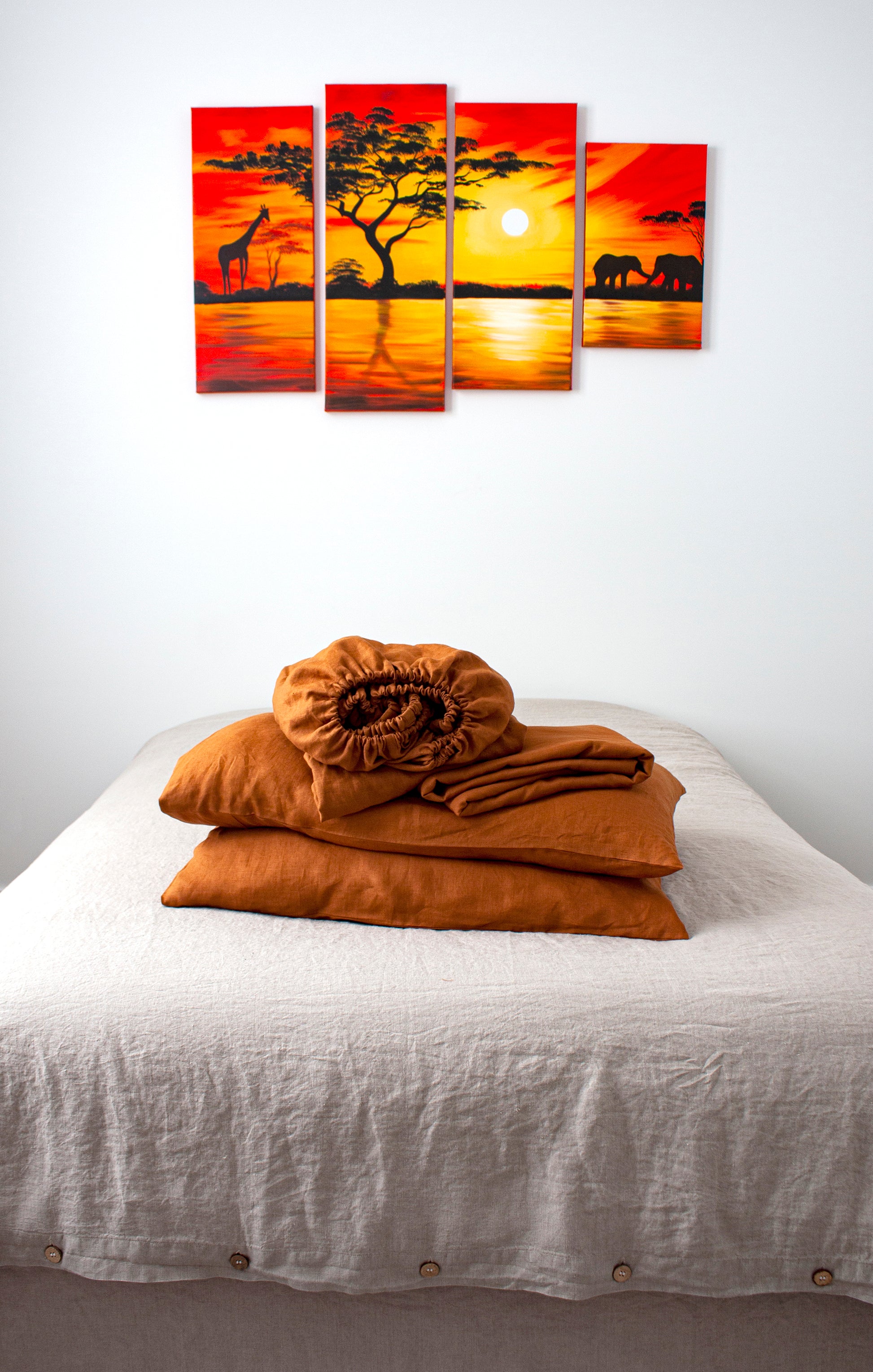 - Includes 1 linen fitted sheet, 1 linen flat sheet and 2 linen pillow cases (side envelope closure)