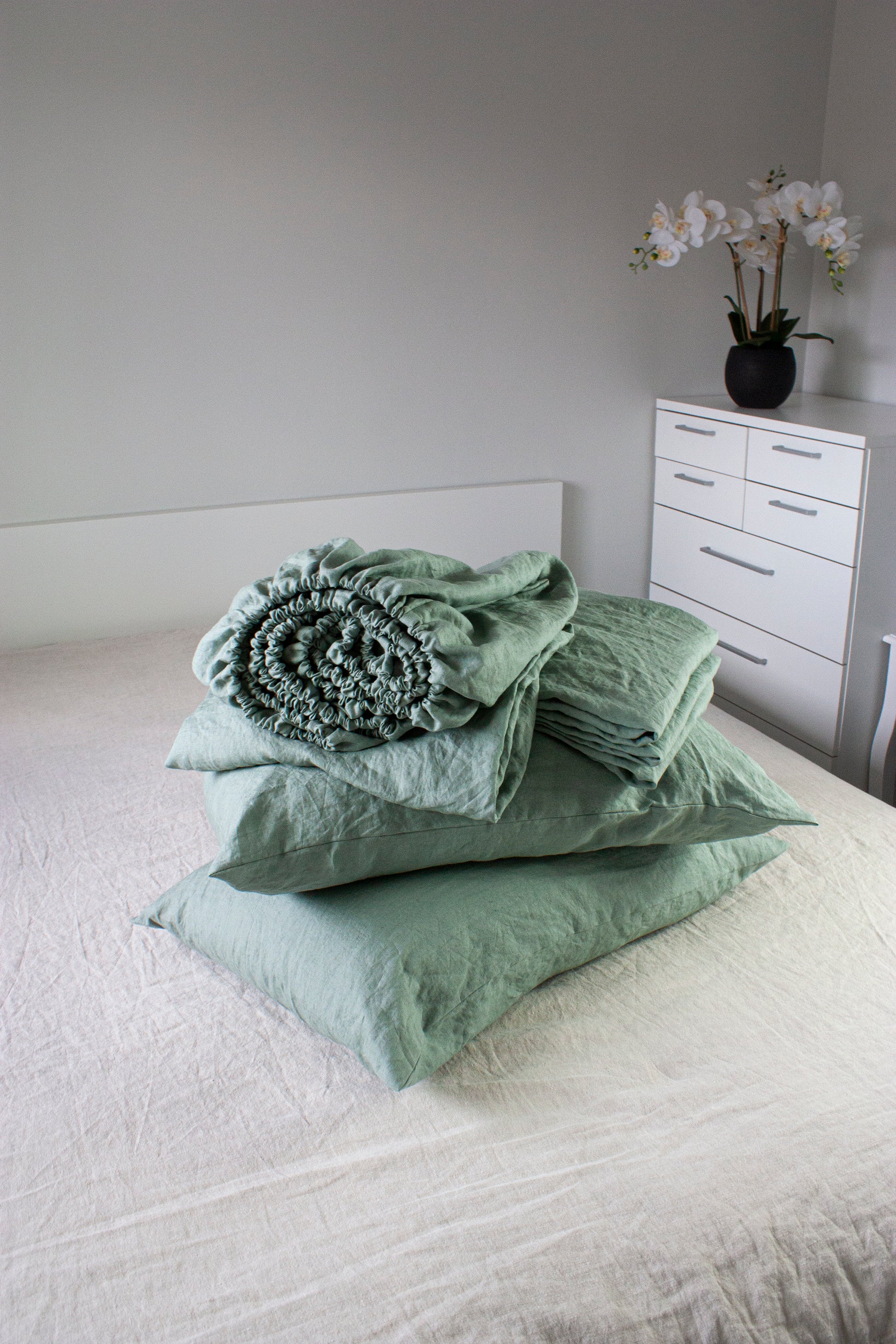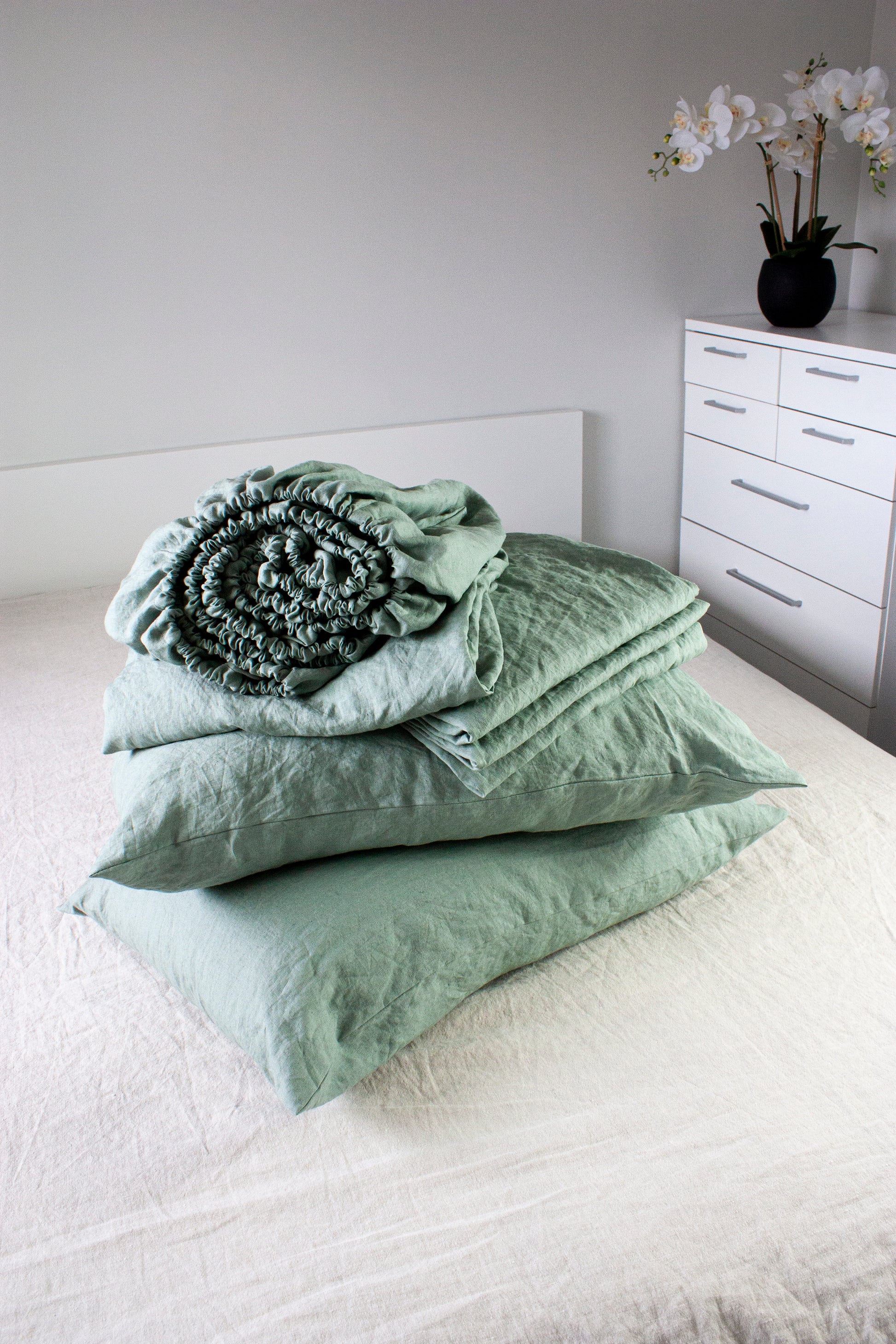 - Includes 1 linen fitted sheet, 1 linen flat sheet and 2 linen pillow cases (side envelope closure)